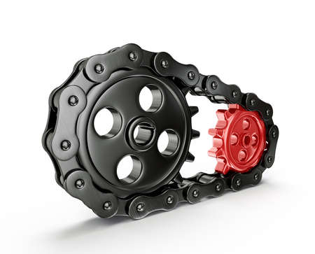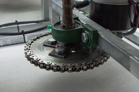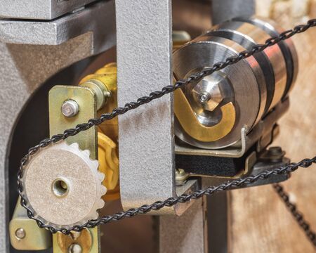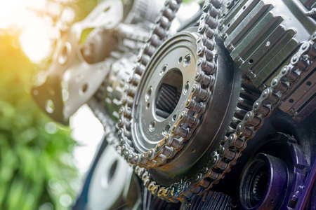 Strand roller chain going around sprockets on industrial machine. industrial engineering technology concept background