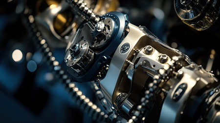 A detailed shot reveals interconnected metal links and gear teeth, emphasizing precision craftsmanship and complex mechanical design in a crisp, focused scene.