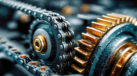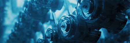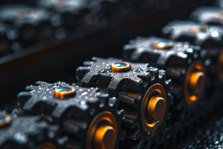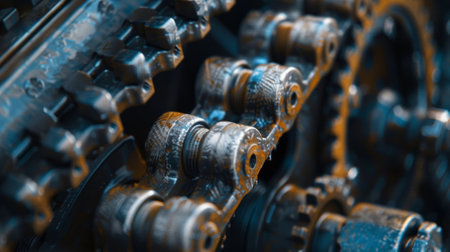 This close-up image showcases the intricate details of mechanical parts and gears in an industrial setting, highlighting technology and engineering innovation.