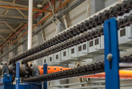 Metal chain of conveyor belt on production line on cable factory