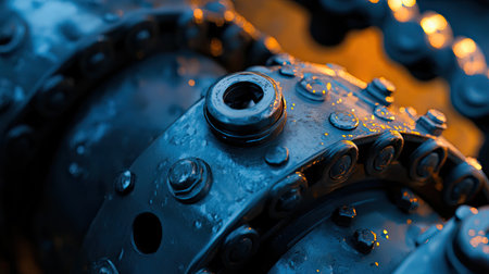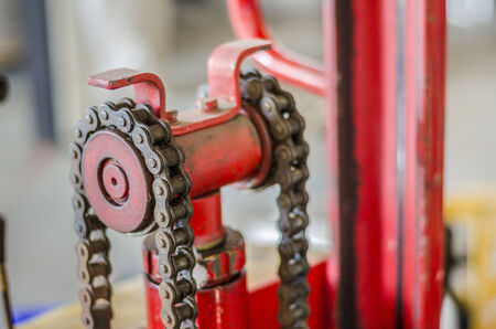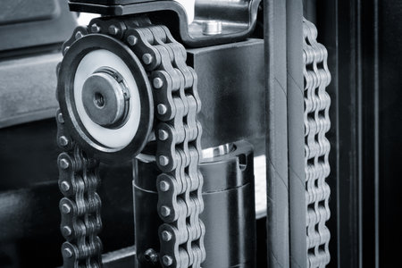 Industrial equipment. close-up photo. Refocused background. The iron components are blue. Chain and chain drive.