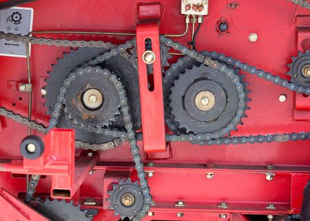 Gear wheels in agricultural machinery. Complexity of chains and gears on red background