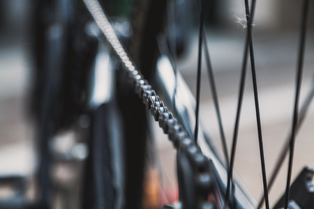 Photograph of a bicycle chain and spokes closeup and blurred background