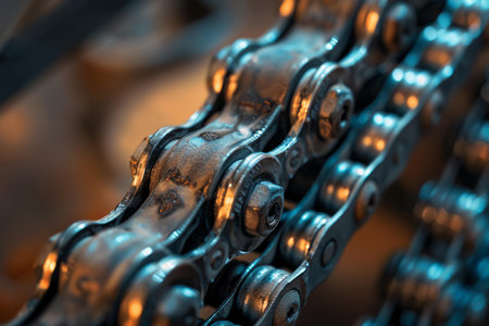 Closeup view of shiny metal bicycle chain links is reflecting warm light