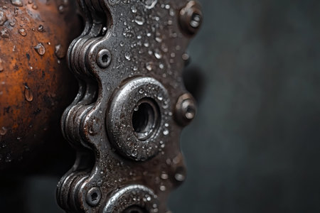 Water droplets cling to a bicycle chain, showing intricate details and textures. The rusty metal contrasts with the shiny components, creating a captivating harmony of vintage style and modern design.