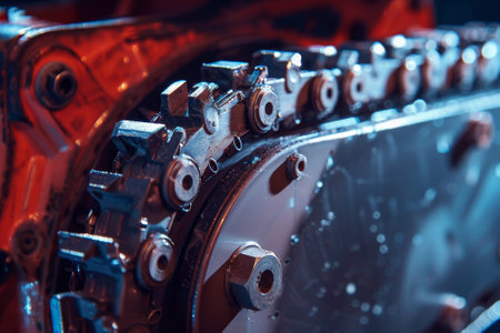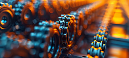 Hyper-Realistic Detail of Timing Belt Gears with Metallic and Orange Highlights. This image captures the intricate details of timing belt gears with precision, highlighted by metallic sheen and orange accents, emphasizing the beauty of industrial design.