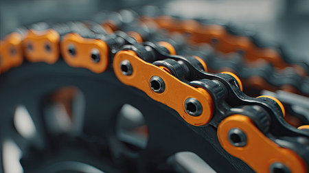 This close-up image showcases a vibrant orange and black bicycle chain, highlighting its intricate details and robust design. Ideal for cycling or engineering themes.