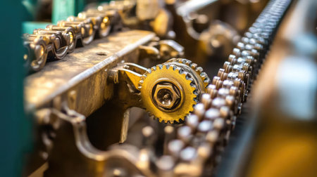 Detailed close-up view of industrial machinery showcasing intricate gears and chains, emphasizing the complexity and precision of mechanical components in a production environment.
