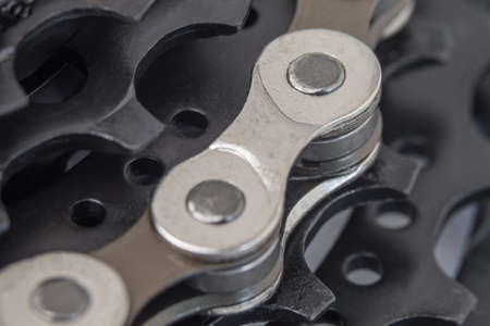 Black teeth of a bicycle cassette and chain links in a macro photo. Selective focus. Background image