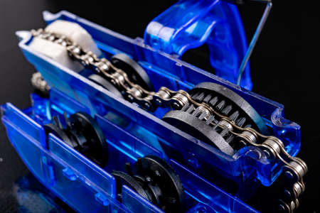 Cleaning the bicycle chain with a device. Small works in a bicycle workshop. Dark background.