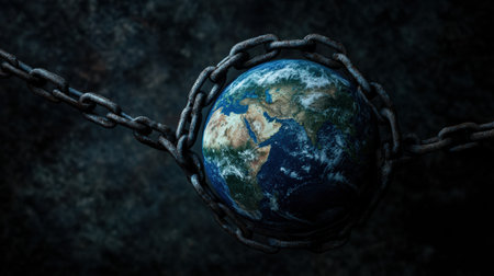 Metaphorical concept featuring a globe or planet Earth enveloped in chains, human-induced climate change and environmental degradation symbol