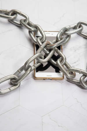 White smartphone with a large metal chain on a white background. Digital detoxification, dependence on technology, lack of concept of gadgets and devices.Place for copy space