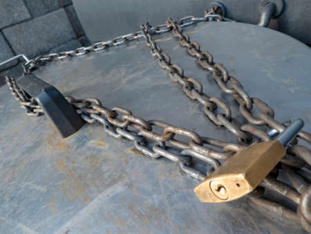 Rusty, wet metal cover with chain and padlock in an urban environment