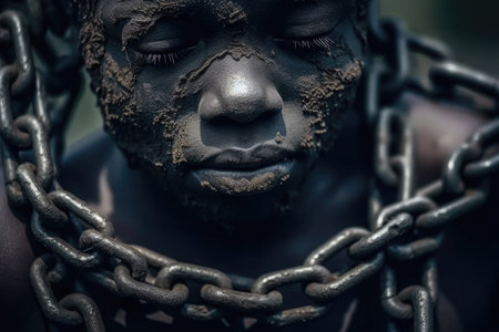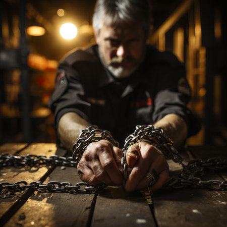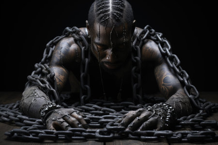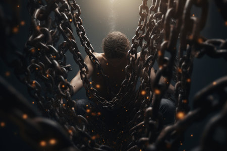 Male prisoner in chain. Slavery concept. Victim chained in captivity. Created with Generative AI