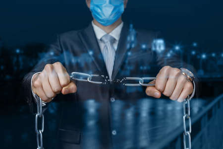 A businessman in a mask breaks the chain on the background of the night city.