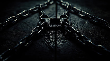 Close-up of padlock and chains on a black background, with spotlight emphasizing strength and security.