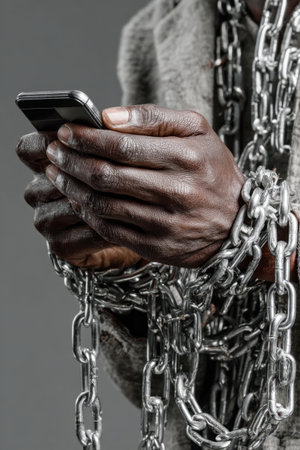 Hands wrapped in metal chains holding smartphone, symbol of digital slavery. Concept of phone addiction and digital slavery