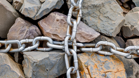 This image showcases a close-up view of a robust metal chain interwoven with natural stones, highlighting their textures and colors in a rugged outdoor setting.