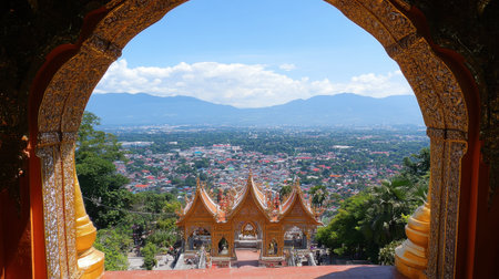 A stunning view from a temple archway, showcasing a vibrant city nestled beneath majestic mountains and a bright, blue sky. Perfect for travel and nature themes.