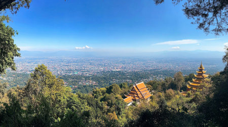 A breathtaking panoramic view of a cityscape and temple from a mountain top surrounded by lush greenery and a vibrant blue sky, ideal for travel themes.