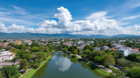 view in the mountains with cityscape over the city airatmosphere bright blue sky background abstract clear texture with white clouds. of Chiang Mai,Thailand
