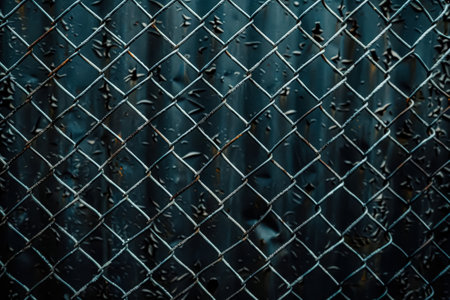 Close up of a chain link fence with water droplets on it. The fence is old and rusted, giving it a worn and weathered appearance. The water droplets add a sense of movement and life to the image