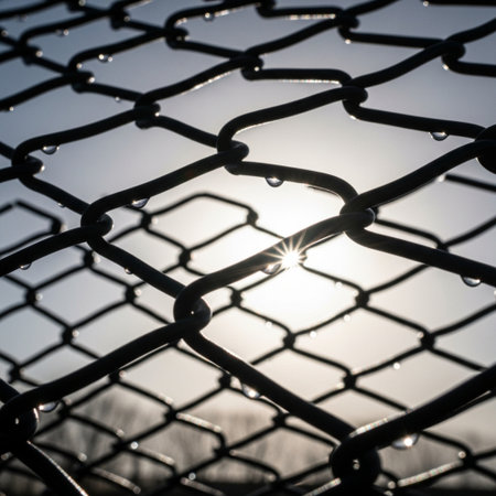 Morning light breaks through a chain link fence, illuminating droplets of water and creating reflections on a tranquil surface in a natural environment.