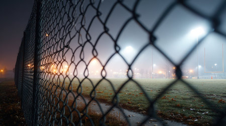 Close-up of a metal mesh fence with a blurry view of a football field beyond, the goalposts and grass visible through the gaps