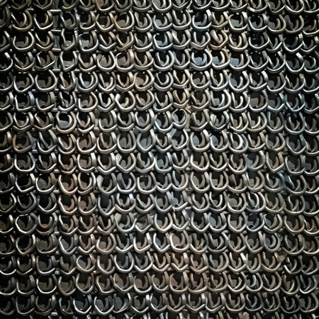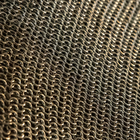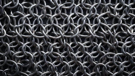 Interlocking Metal Rings Chainmail Texture. Medieval armor detail showcasing connected iron links.