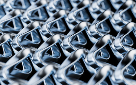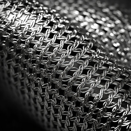 A creative digital illustration depicting High quality creative design of fine white chainmail mesh texture, metallic weave detail, even lighting, armored opulence. This AI-generated artwork features unique visual elements suitable for various commercial and editorial applications. AI-generated illustration.