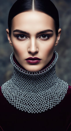 beautiful woman in dress arm in armor chain mail protection unaltered