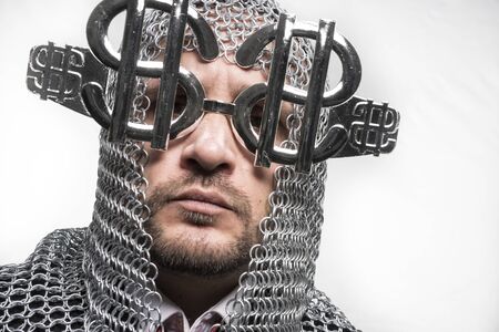 businessman with medieval executioner in metal and silver glasses. concept of protection of savings and money