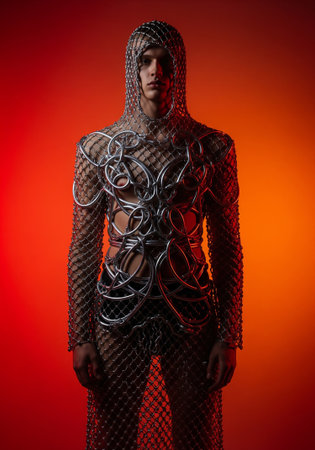 Portrait of a man in a chain mail costume on a red background.