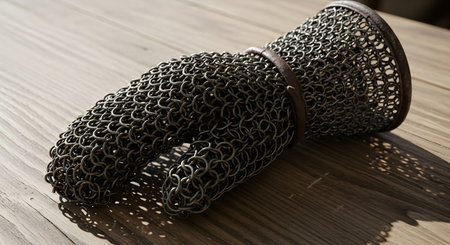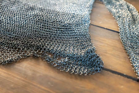 An authentic medieval knight's gauntlet made of interlocking chainmail rings with a leather strap lies on a wooden surface. The image highlights the intricate craftsmanship of historical armor used for protection in battle during the Middle Ages.