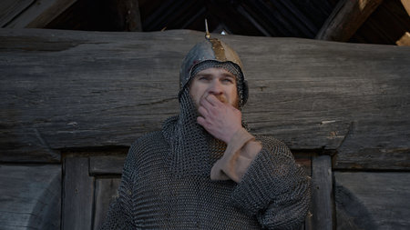 Medieval knight in steel armor against the background of castle walls. The medieval knight stands guard at the castle walls, showcasing the craftsmanship of his gleaming armor.