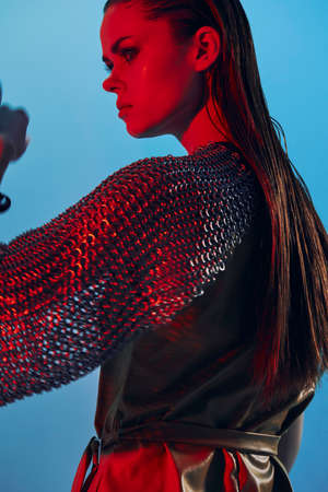 beautiful woman in dress arm in armor chain mail protection unaltered