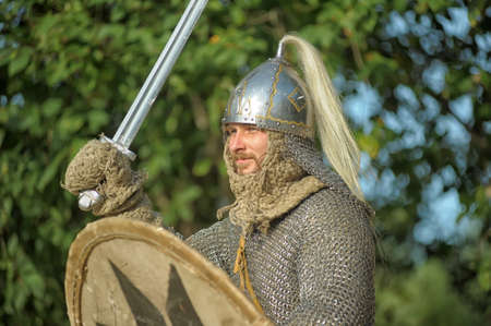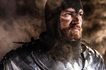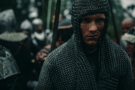 Portrait of young man in the image of a medieval knight in chain armor on background of his combat squad.