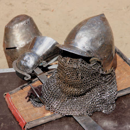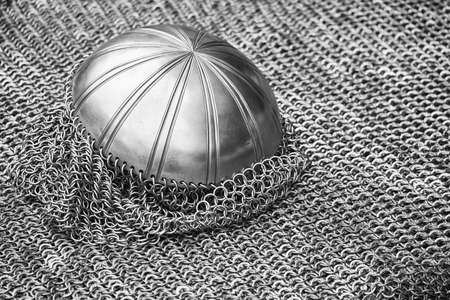 Modern copy of antique metal knight helmet with aventail. Historical medieval costume detail
