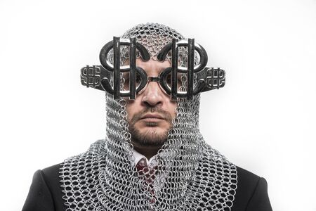 businessman with medieval executioner in metal and silver glasses. concept of protection of savings and money