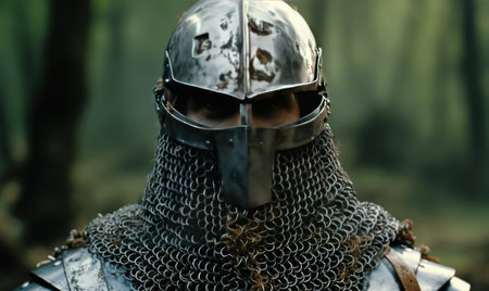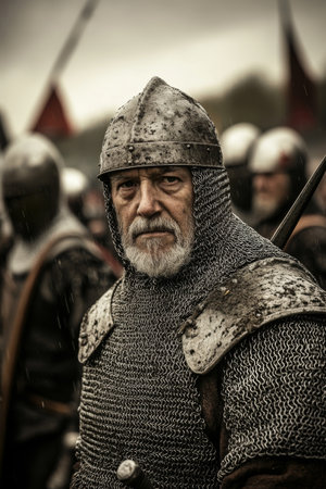 Medieval knight wearing chainmail armor and helmet and other warriors in background. Army of soldiers ready for battle