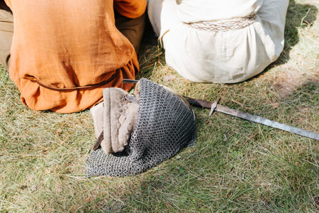 Medieval sword hilt, chainmail, sword and shields a medieval armor knight ready for battle detail. Medieval reenactment