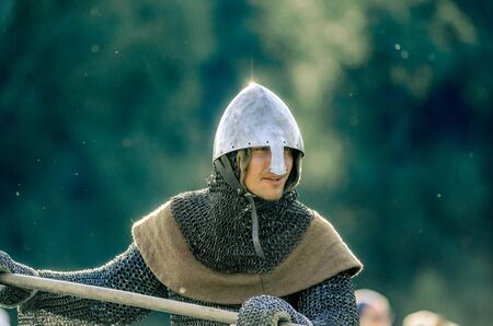 RITTER WEG, MOROZOVO, APRIL 2017: Knight goes on attack with a spear in his hands. Attack of powerful knight in heavy armor