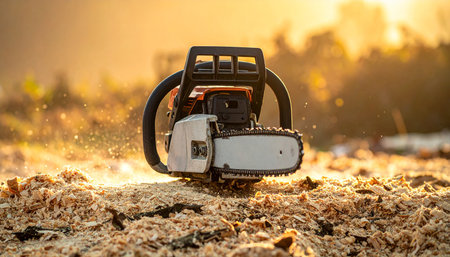 A close-up view of a gasoline powered chainsaw on wood shavings. The background is blurred with golden sunset light, creating a soft bokeh effect.