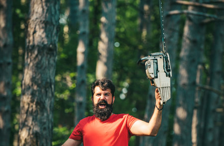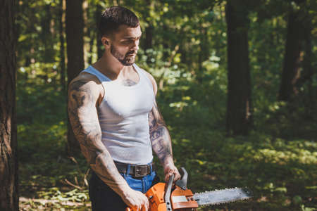 Lumberjack with chainsaw on forest background. Lumberjack worker with chainsaw in the forest. Man doing mans job. Woodcutter with axe or chainsaw in the summer forest.
