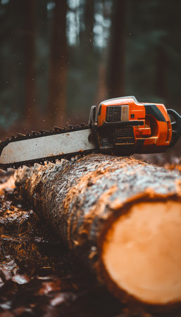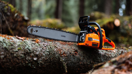 Chainsaw resting on a freshly cut log amidst a vibrant and serene forest environment.