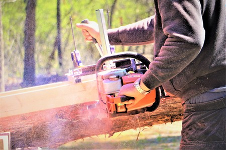 Man is sawing a wood with an electrical chainsaw at carpentry.