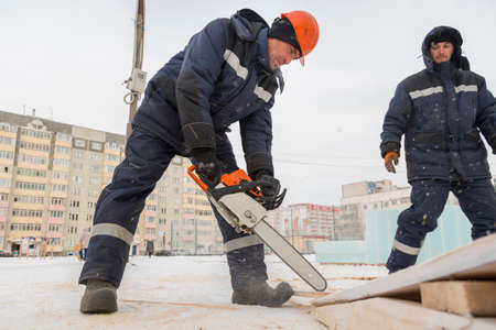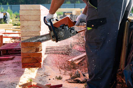 A construction worker cutting boards with a chainsaw in construction. focus on chainsaw