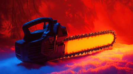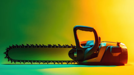 A vibrant image of an industrial chainsaw resting on a smooth surface with a colorful background, highlighting its design and functionality for various tasks.
