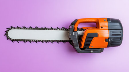 A vibrant electric chainsaw featuring a sharp blade, ideal for efficient wood cutting and landscaping tasks, set against a playful pink background.