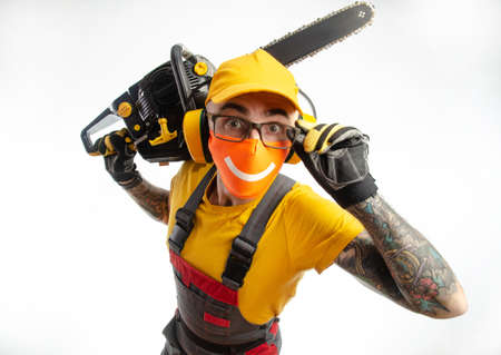 portrait of aggressive muscular male lumberjack, woodworker with chainsaw in hand, posing